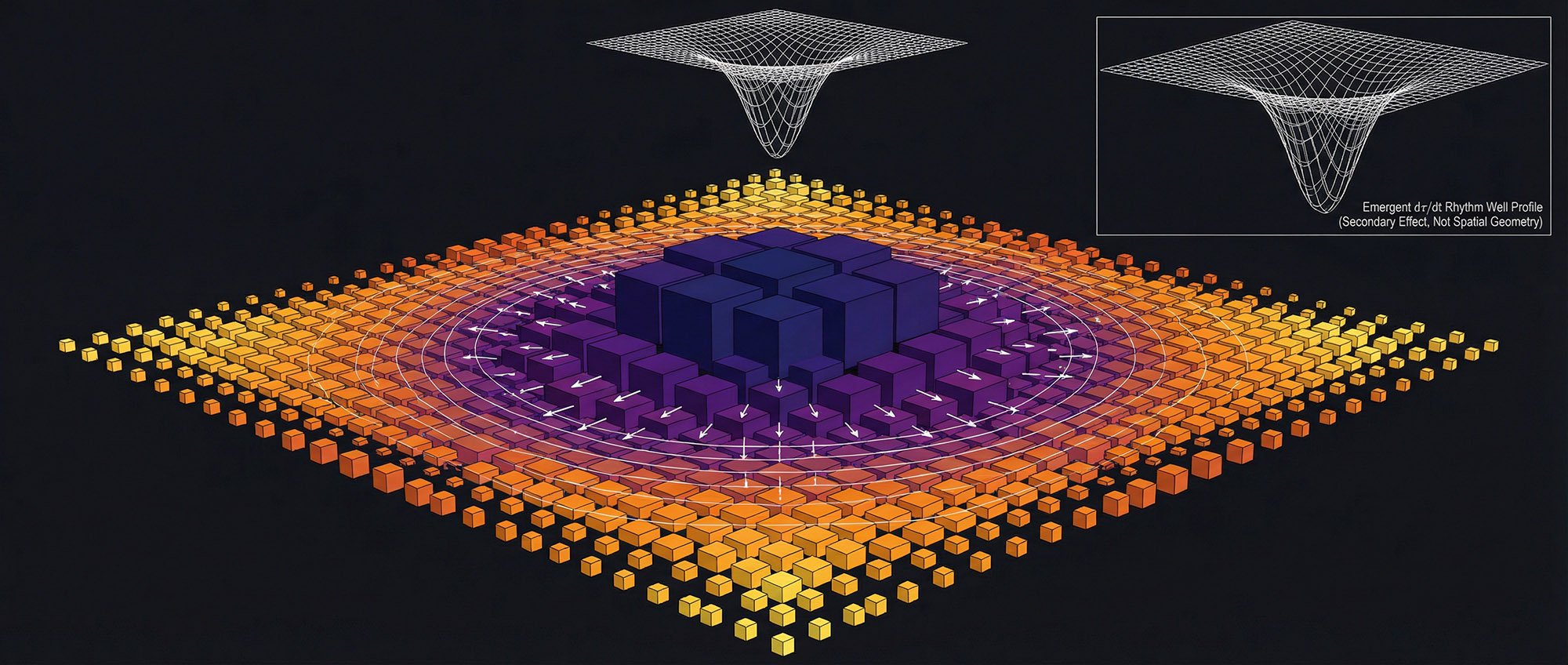 W modelu MĀYĀ nie jest siłą ani zakrzywieniem czasoprzestrzeni, lecz skutkiem lokalnego spowolnienia rytmu aktualizacji informacji. Tam, gdzie wzrasta złożoność i „koszt” przeliczeń, takt lokalnie się wydłuża — a gradient tego spowolnienia między układami tworzy dokładnie to, co obserwujemy jako przyciąganie grawitacyjne.