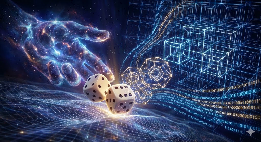 Ironia polega na tym, że geometrycznie… Bóg, jakkolwiek nie zdefiniujemy tej nadrzędnej zasady/rzeczywistości, jednak gra w kości. Tylko że nie są to kości do gry w hazard, ale Bryły Platońskie. Struktura próżni, którą badamy, opiera się o geometrię sześcianu. To są „kości”, z których zbudowana jest rzeczywistość. Ale nikt nimi nie rzuca na oślep. One układają się w krystaliczny wzór.