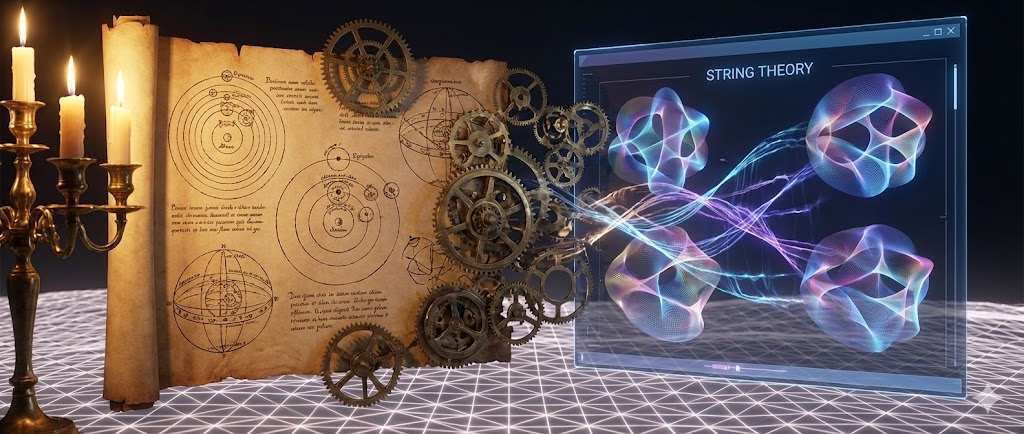 Co robi współczesna fizyka teoretyczna? Rysuje nowe epicykle. Nazywa je Teorią Strun. Aby równania się spięły, matematycy muszą dodawać do naszego świata kolejne, ukryte wymiary. 10, 11, a w pierwotnej wersji (Bozonowej Teorii Strun) aż 26 wymiarów. Gdzie one są? Fizycy twierdzą, że „zwinęły się” w mikroskopijne supełki, których nigdy nie zobaczymy.